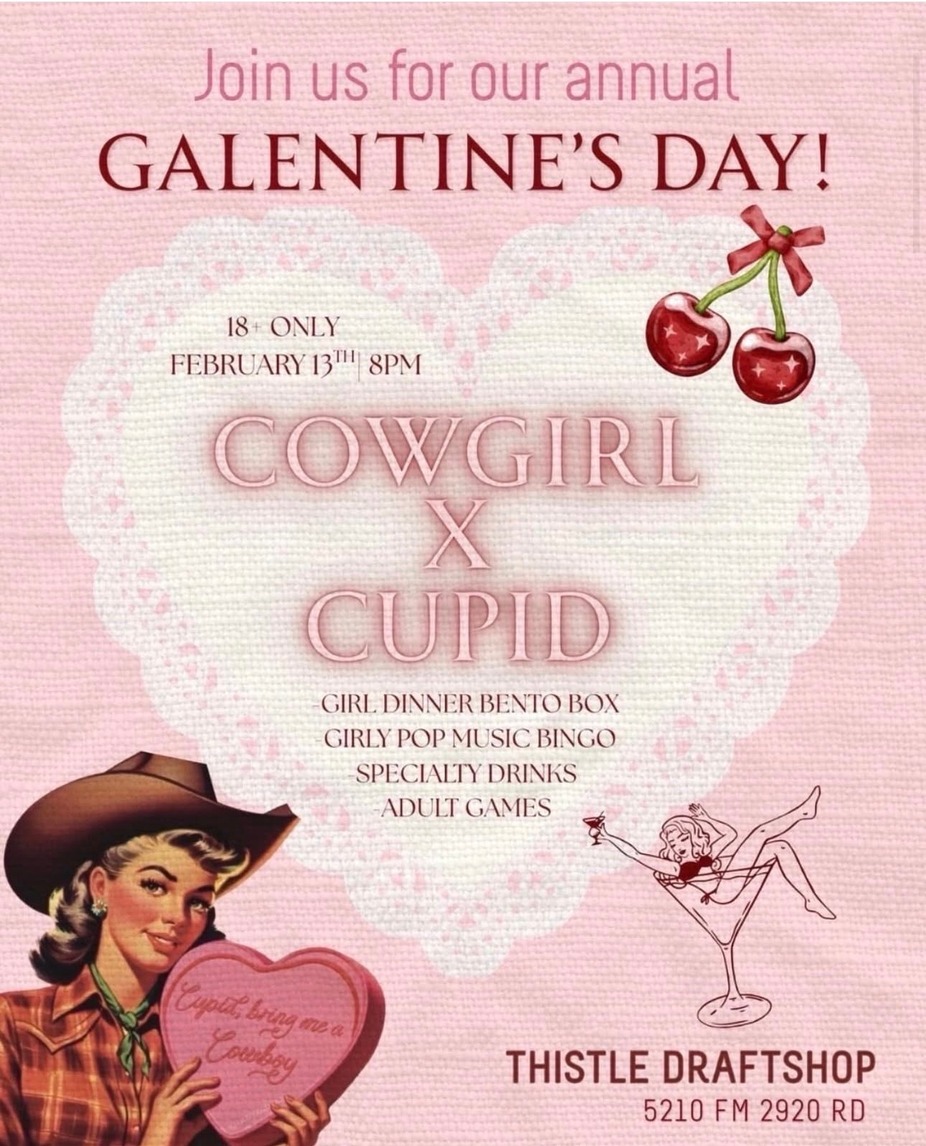 Grab your gals and saddle up for our annual Galentine’s Day party! 🎀 Girl dinner bento boxes 🎶 Girly pop music bingo 🍾 Specialty drinks 😈 Adult games 🩷 Feb 13 | 8PM | 18+ only